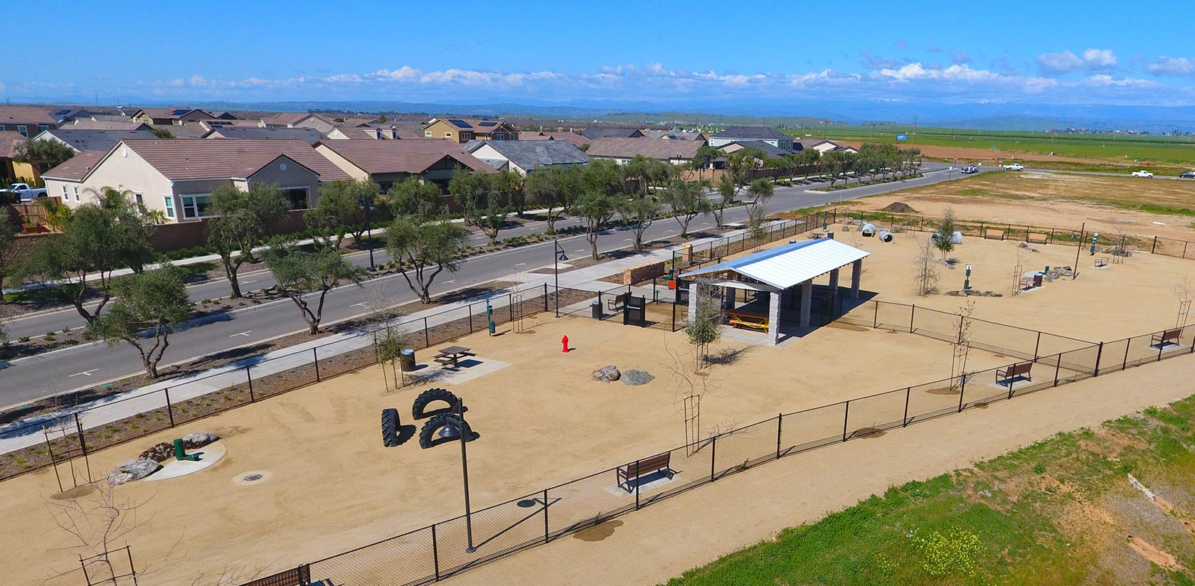 Just a short walk away from homes, Pavilion Park features play equipment, tire swings and an enclosed mini field