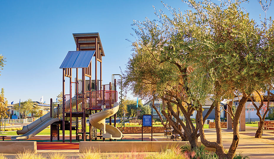 Riverstone’s Garden Park features barbecue areas, a kids’ play structure and a large communal table for outdoor dining. It’s one of five parks in the community’s Lodge District residential neighborhood.