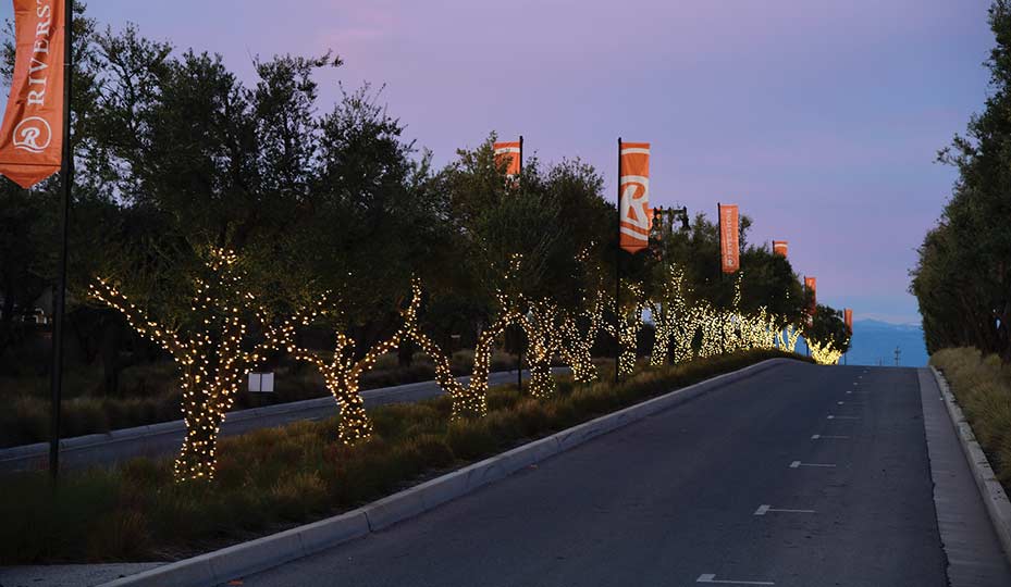 The beautiful olive trees surrounding Riverstone, a nod to its agrarian past, are perhaps the most visible sign of positivity. With bright-white lights illuminating most of the trees, the nightly scene casts a warm, welcoming glow—a literal and figurative beacon of hope in troubling times.