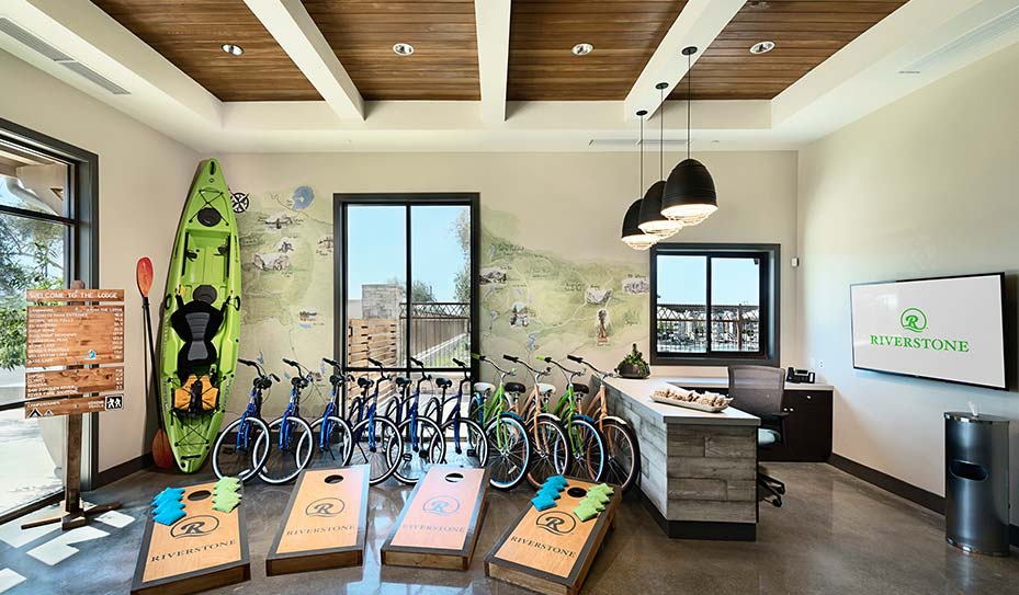 Located in The Lodge community clubhouse at Riverstone, the Gear Barn is an outfitter’s cabin featuring a variety of recreational gear available for homeowners’ on- and off-site adventures.
