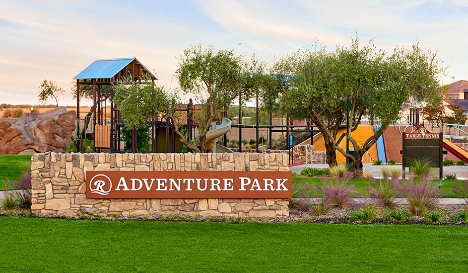 Just a short walk or bike ride away from Riverstone’s homes, Adventure Park offers play structures, climbing boulders, three different slides and grassy areas for all kinds of kid-sized fun.