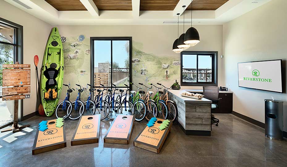 Located in The Lodge community clubhouse at Riverstone, the Gear Barn is an outfitter’s cabin featuring a variety of recreational gear available for homeowners’ on- and off-site adventures.