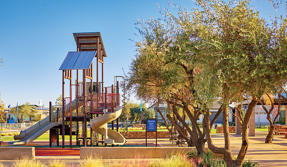 Riverstone’s Garden Park—designed for more relaxing, adult-sized fun—features barbecue areas, bocce ball, shade structures and a large communal table ideal for outdoor dining.