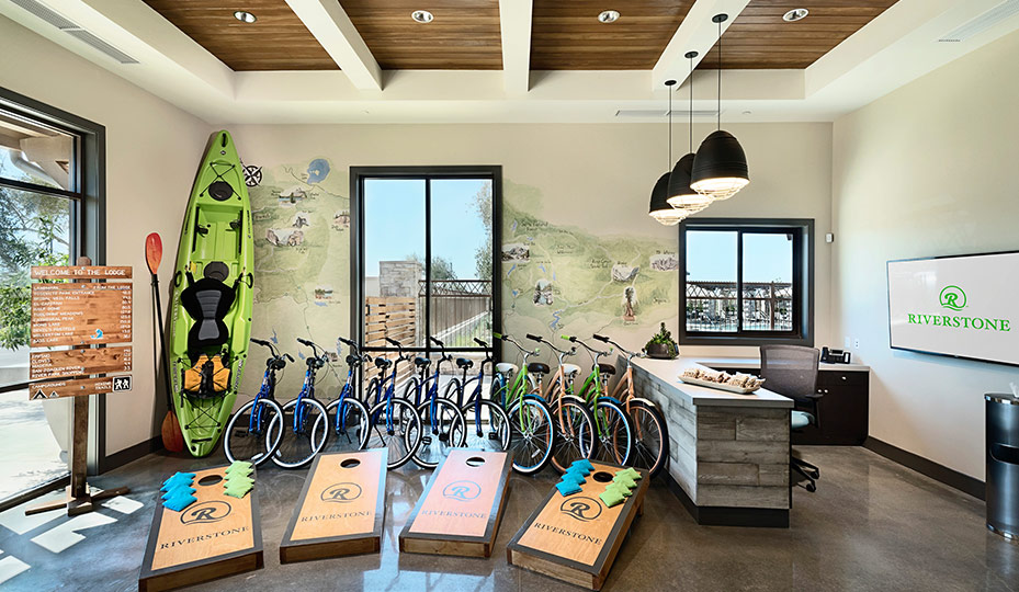 Located in The Lodge community clubhouse at Riverstone, the Gear Barn is an outfitter’s cabin featuring a variety of recreational gear available for homeowners’ on- and off-site adventures.
