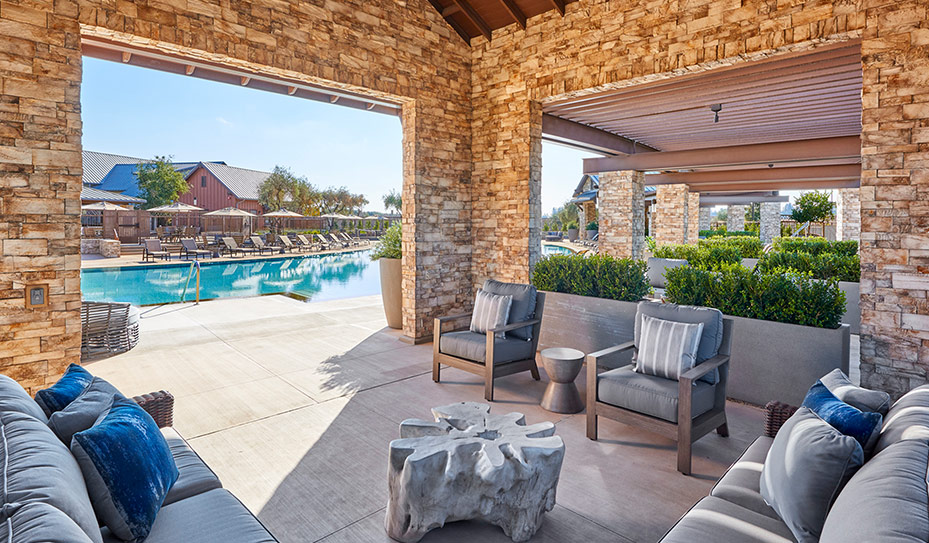 Within the expansive interior spaces of The Lodge are a multitude of exceptional amenities, including a Great Room and flexible gathering spaces with WiFi, a demonstration kitchen and a state-of-the-art Fitness Center offering advanced exercise equipment as well as free weights. Just outside, The Lodge features a resort-style pool and spa with poolside cabanas, a children’s pool and splash pad, an outdoor bar with firepit conversation areas and a community garden.