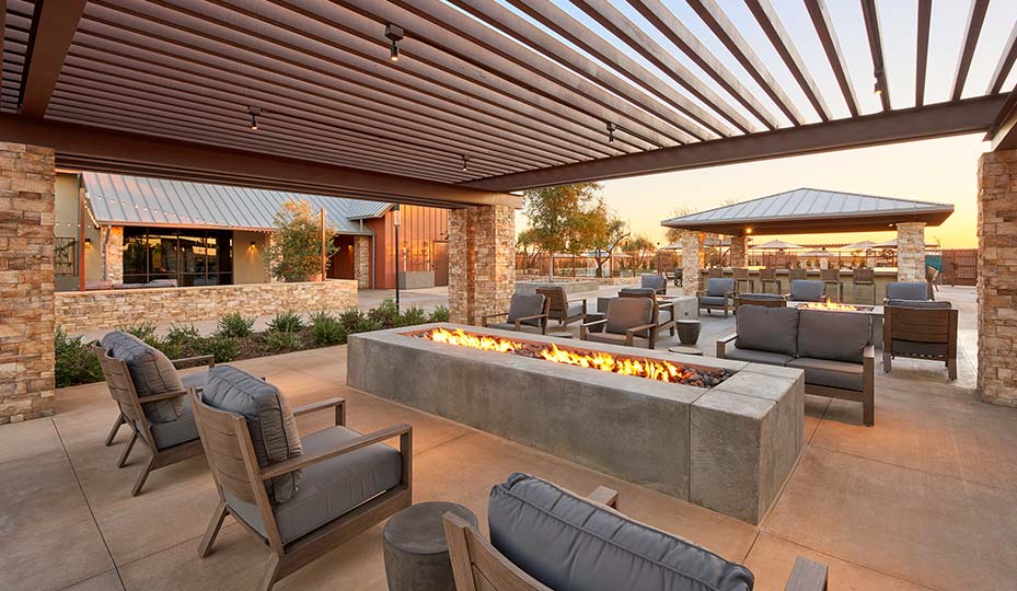 The expansive grounds of The Lodge at Riverstone feature an outdoor bar as well as comfortable gathering places surrounding stylish firepits.